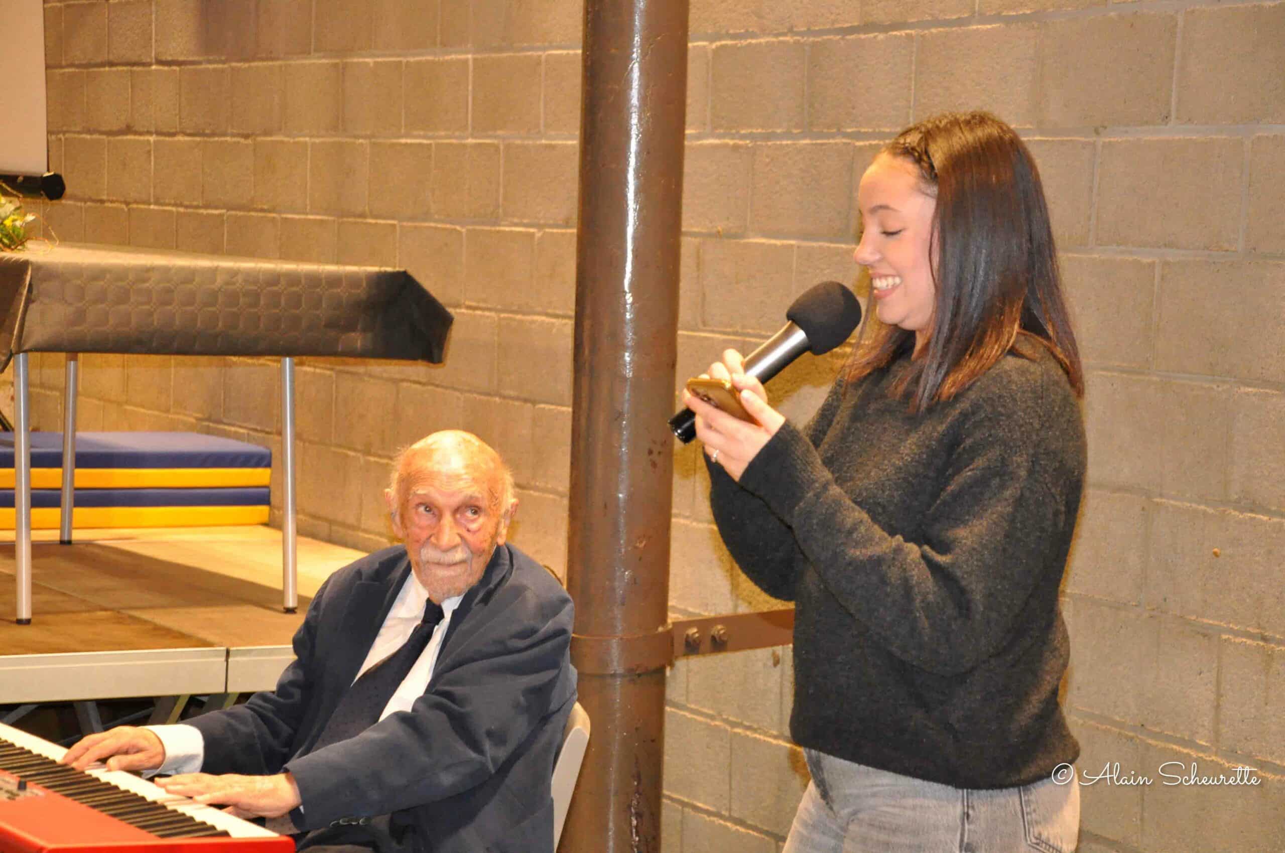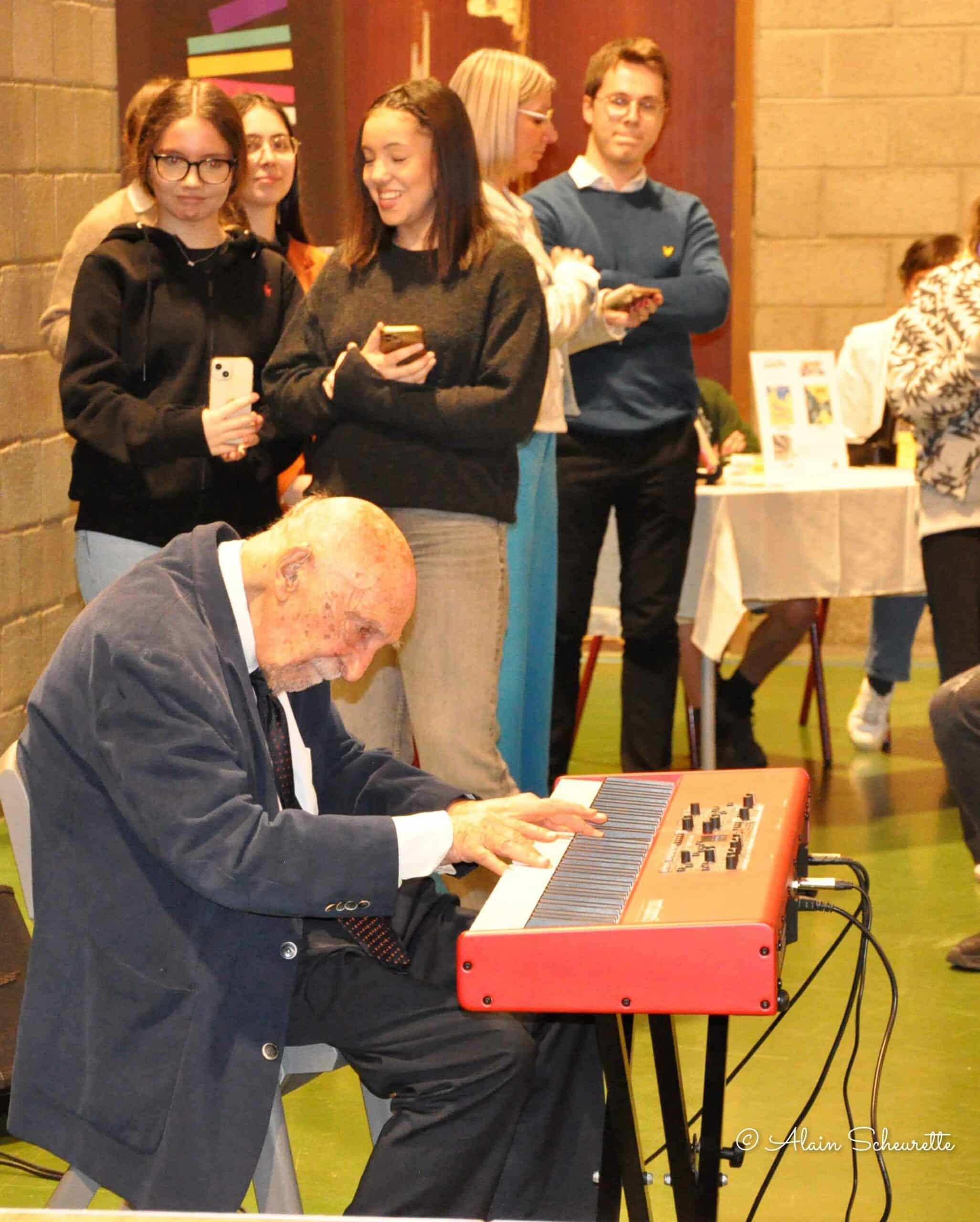 Moment magique : à la fin de la soirée, Monsieur Gronowski (93 ans !) s’est mis au synthé pour quelques morceaux de jazz, mais aussi pour accompagner Ryslane Amina, élève de 6A, qui interprétait « Imagine » de John Lennon.