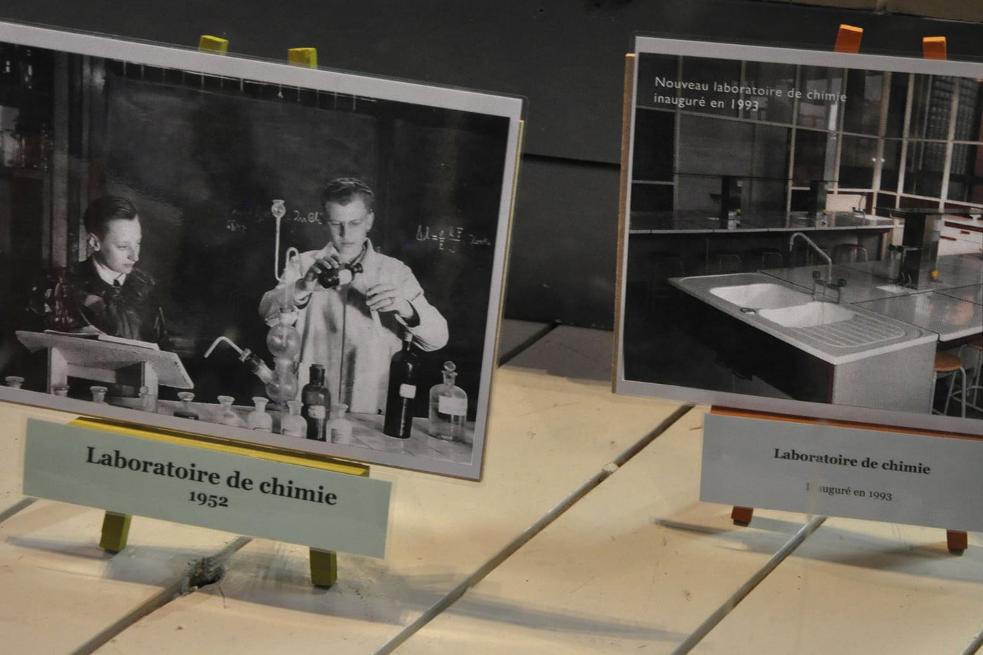 Ci-dessous un petit album avec quelques photos de la vitrine nouvellement arrangée par un ancien professeur, M. Alain Scheurette, pour la célébration de cet anniversaire. (Cette vitrine se trouve rue du Collège, près de l’entrée principale de l’école, du côté gauche de l’entrée du hall de sports.)