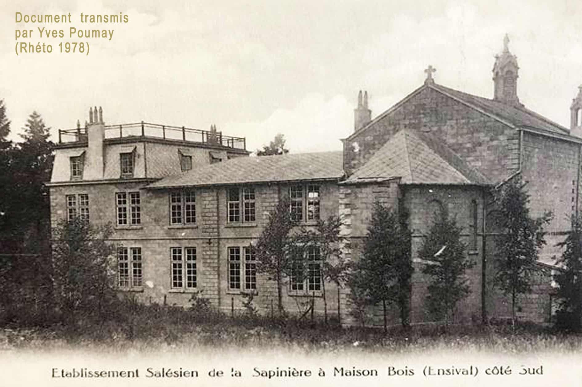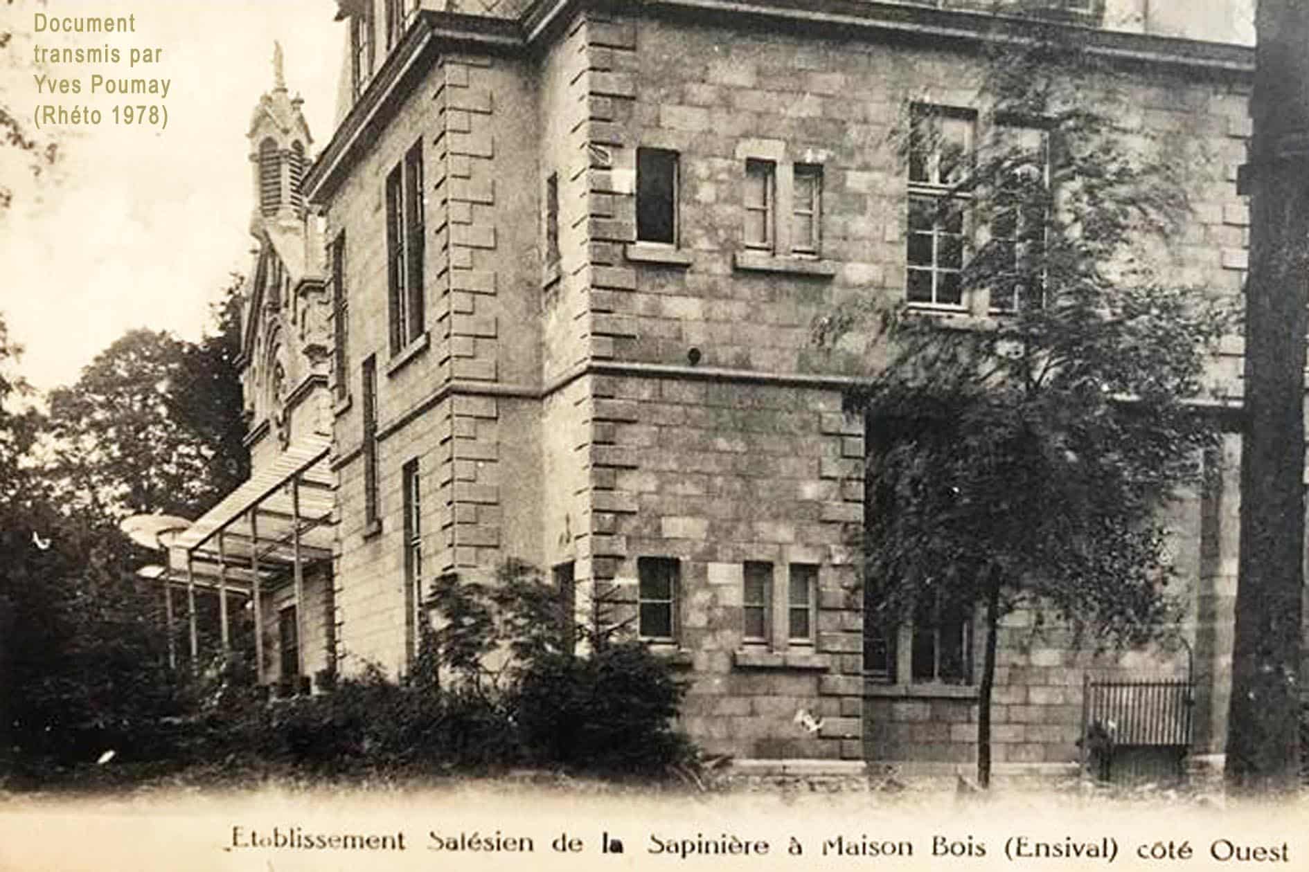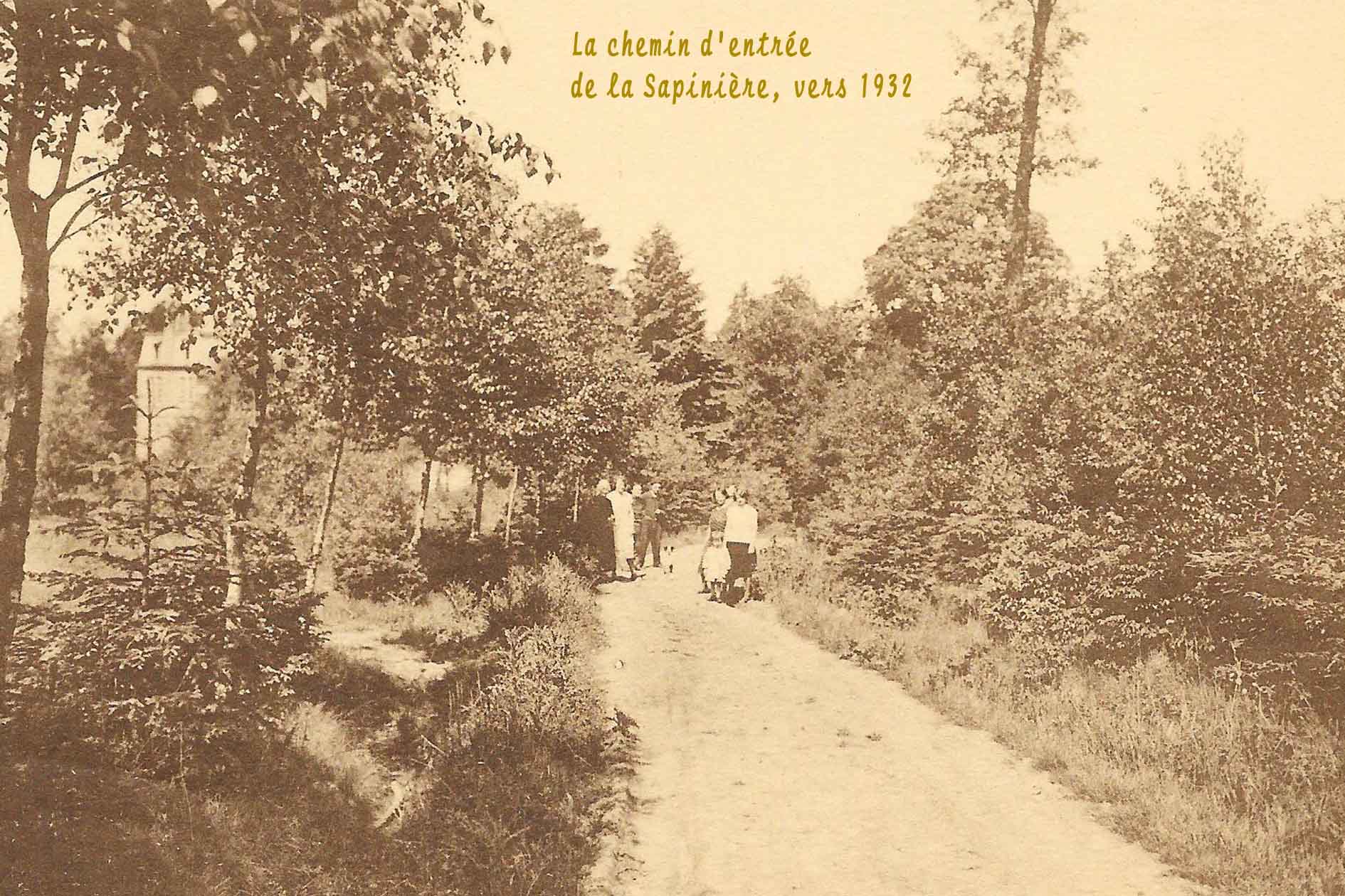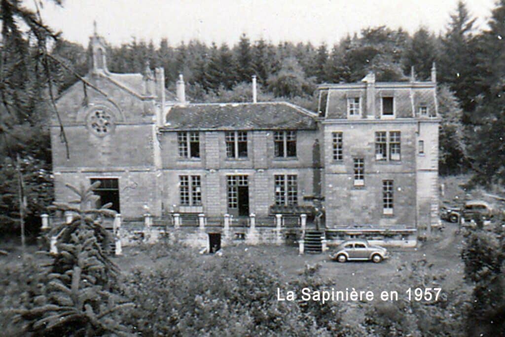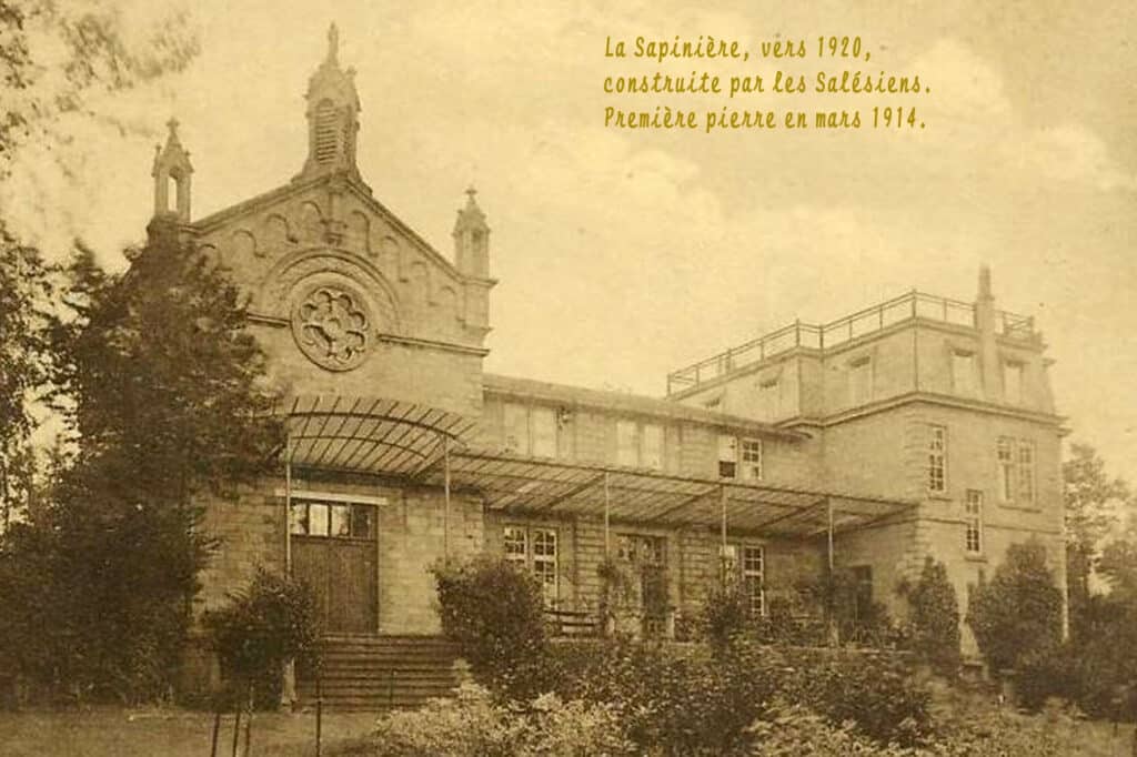 L’histoire de la Sapinière commence fin 1913 lorsque le comte de Pinto permet au Père Blain, directeur de Don Bosco, de construire près de Maison-Bois une grande chapelle accolée à une maison pour les retraitants. Bénédiction de la première pierre le 30 mars 1914 et bénédiction solennelle de la statue de Notre-Dame Auxiliatrice le 13 juin 1915. La première retraite a lieu en 1916.
