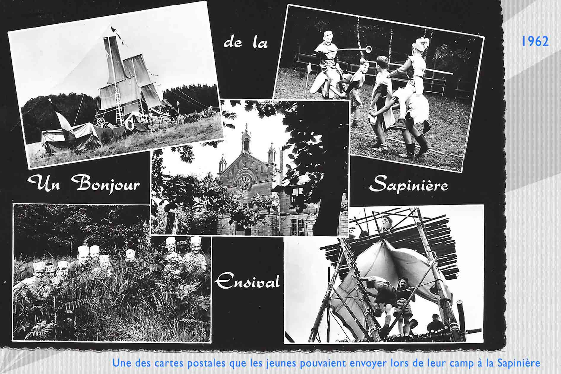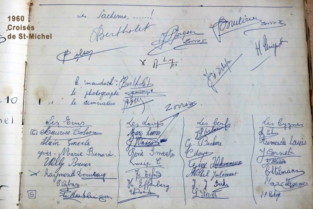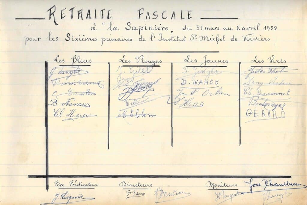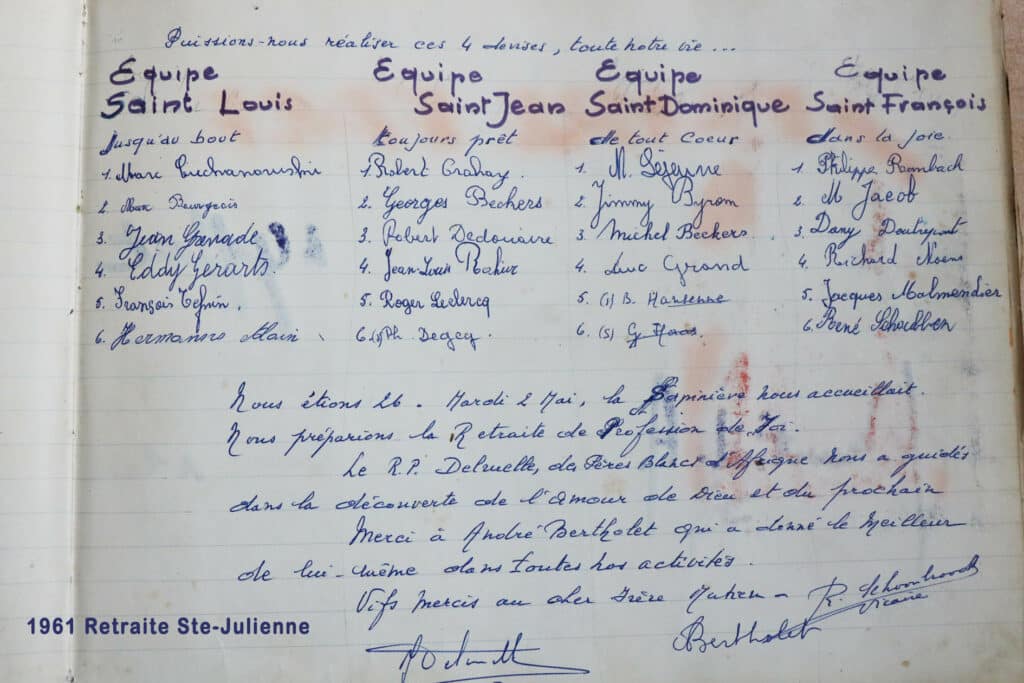 Les camps de jeunes, les retraites et récollections pour élèves et communiants se succèdent, comme on peut le constater dans le livre d’or. (Non seulement on y trouve les camps des Croisés de St-Michel, mais aussi les signatures de visiteurs « fidèles »: camps de Montigny-sur-Sambre, Gosselies, Tournai, retraites de Sainte-Julienne et Saint-Roch…) Durant les mois de juillet et d’août, deux cents jeunes viennent s’ébattre dans ce lieu merveilleux. La Sapinière connaît une vie trépidante… on y organisera même des fancy-fairs et quelques soirées dansantes.