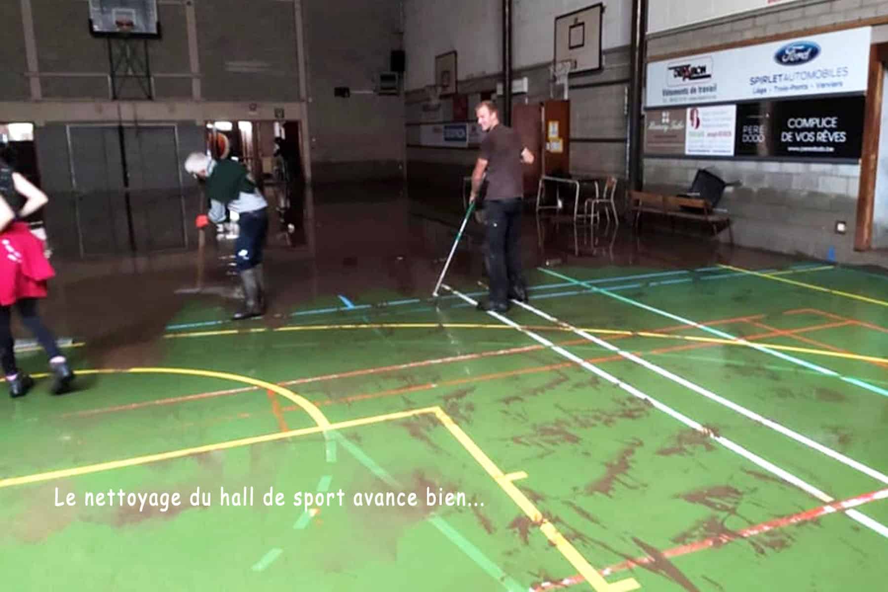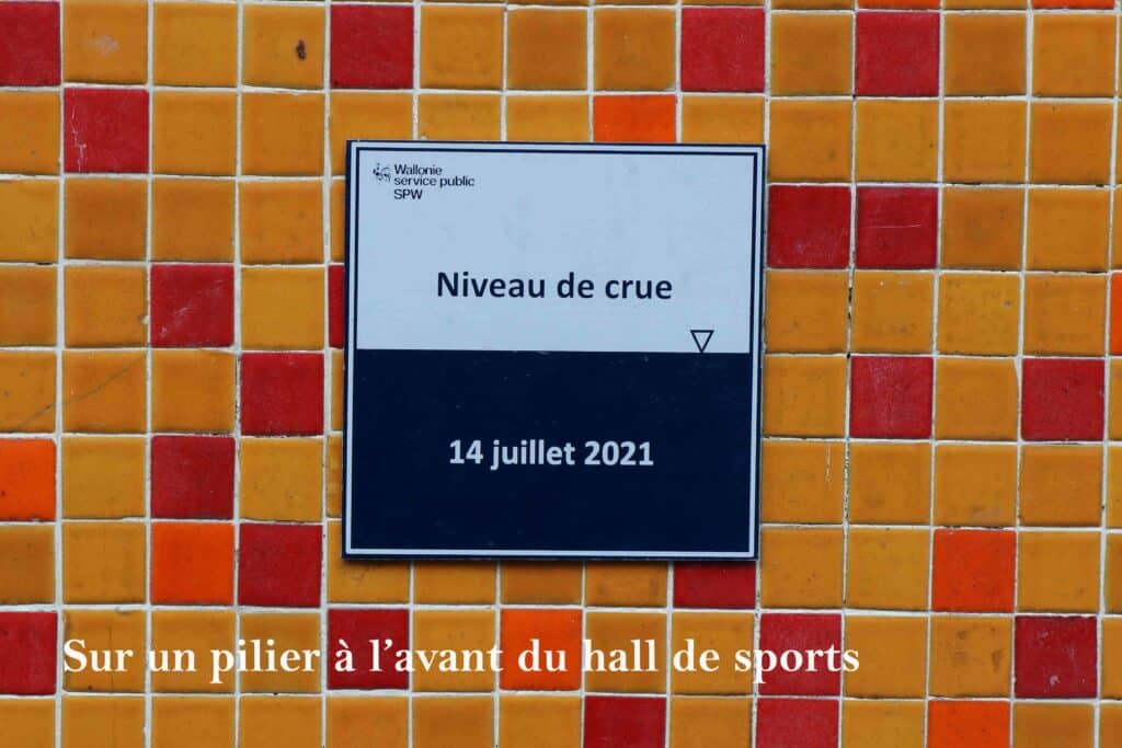 A l’entrée du hall de sports une plaquette rappelle à chacun jusqu’à quelle hauteur l’eau est montée ce 15 juillet 2021. (Voir dernières photos de l’album)