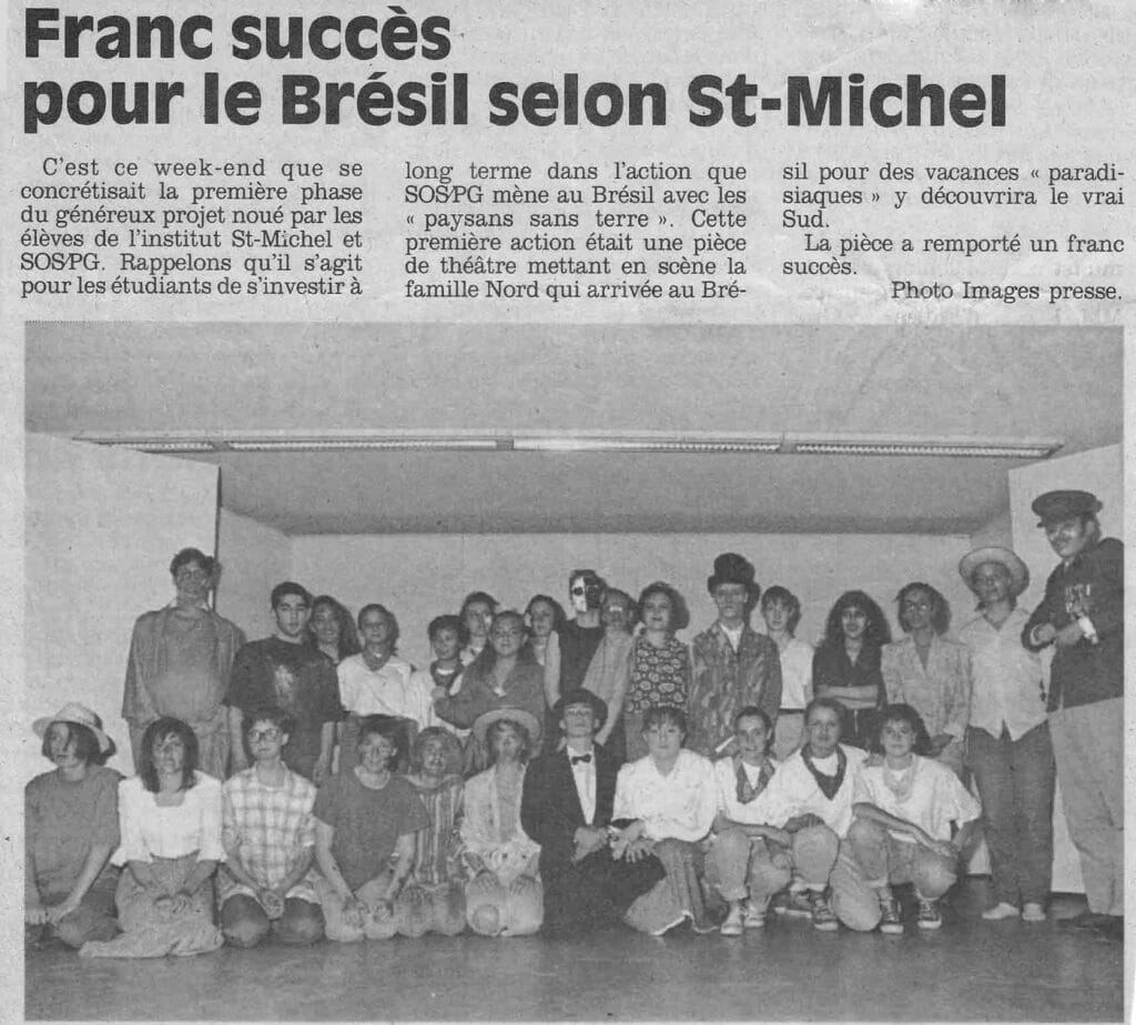 C’est dans ce cadre que, dans les années 90, les élèves ont été amenés à réfléchir et à agir au profit des paysans sans terre du Brésil. Ce projet, qui a accompagné nos classes pendant plusieurs années, était soutenu et encadré par des professeurs (Jean-Luc Gilon, Maurice Detry, Guy Simonis, Jacques Lelotte…), mais aussi par la section verviétoise d’une ONG, SOS/PG, dont le correspondant pour Saint-Michel était M. Guy Bouchat. Il s’agissait de venir en aide aux paysans de Biritinga.
