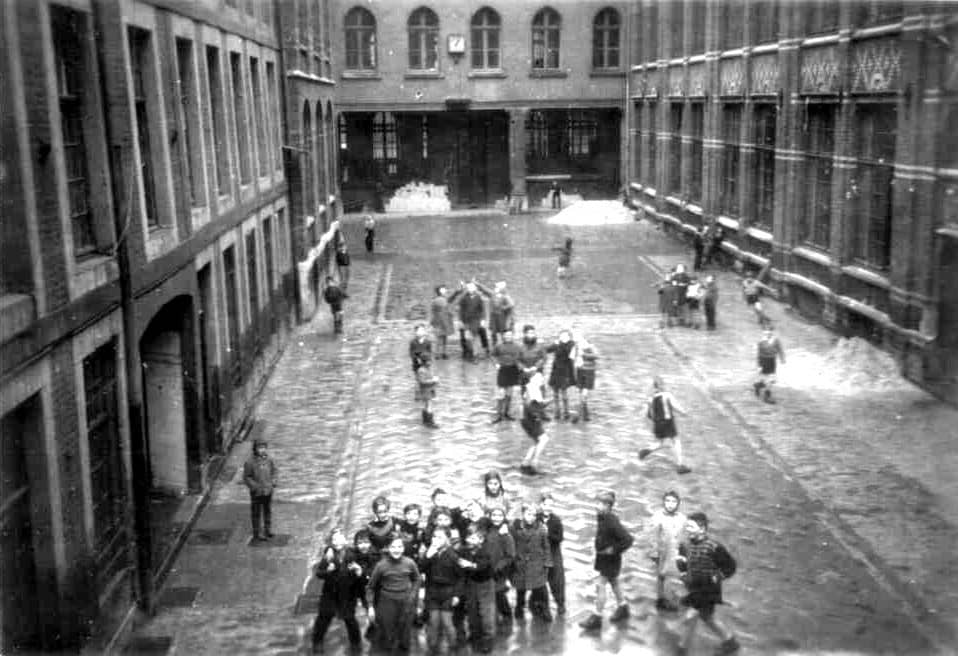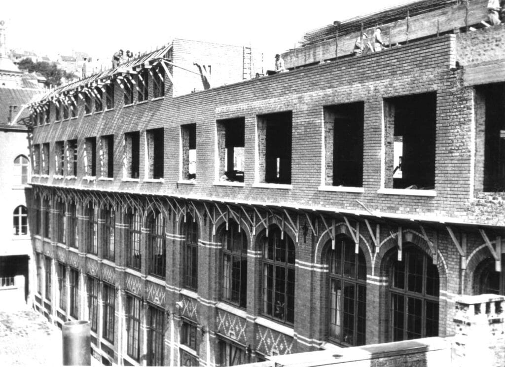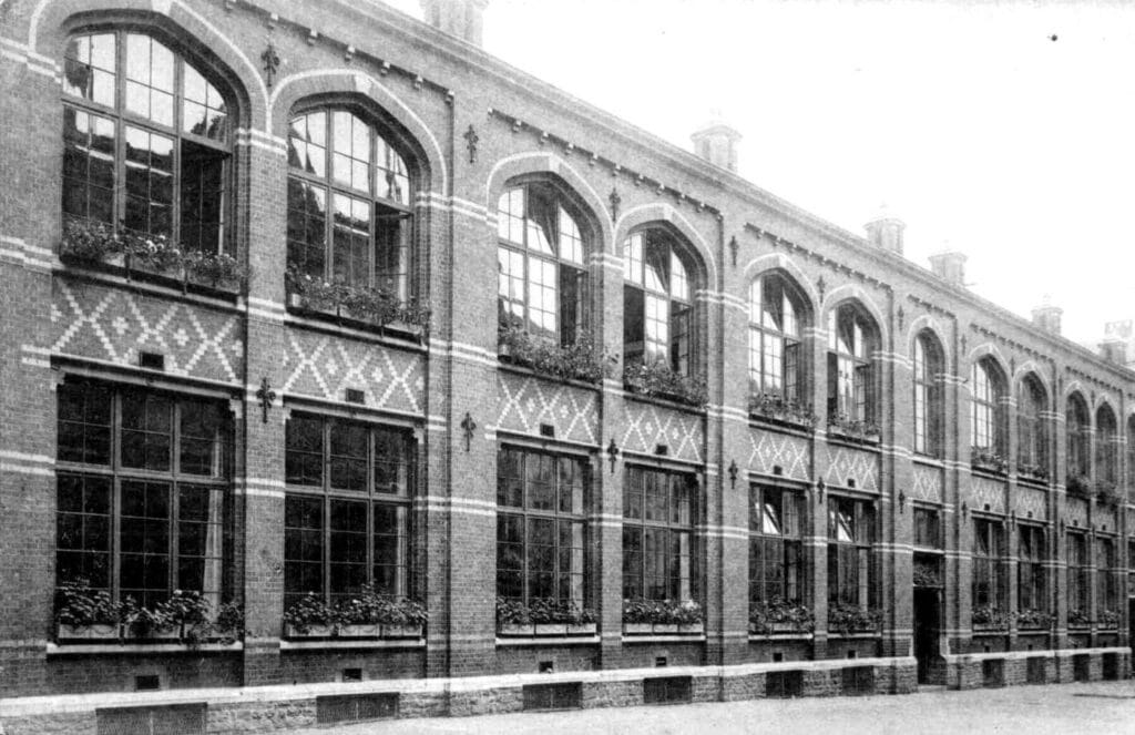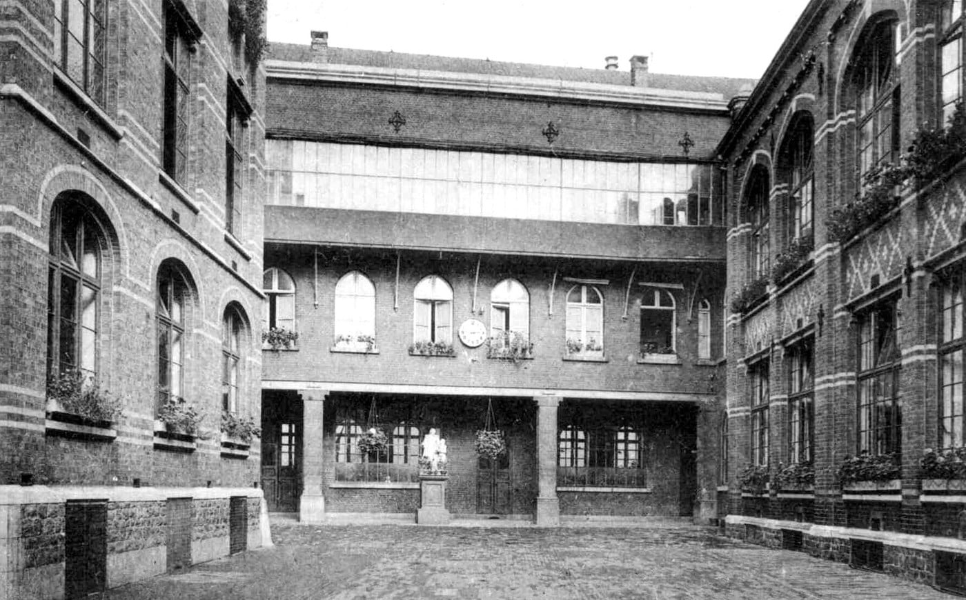 Cependant, les Frères sont à l’étroit dans le logement de la rue des Grandes Rames et, en 1872, la Commission des Ecoles Chrétiennes fait l’acquisition d’une vaste propriété située entre les rues du Collège et du Gymnase. Cette propriété, qui appartenait aux soeurs Pirard et qui abritait une ancienne fabrique ainsi que les logements des ouvriers, comprend une maison d’habitation, une cour – bordée à gauche et à droite de deux vastes bâtiments – et un grand jardin. Mais ce n’est qu’en 1877, après de nombreux aménagements, dont la construction d’un nouveau bâtiment en fond de cour, que les Frères purent s’installer dans ces nouveaux locaux.