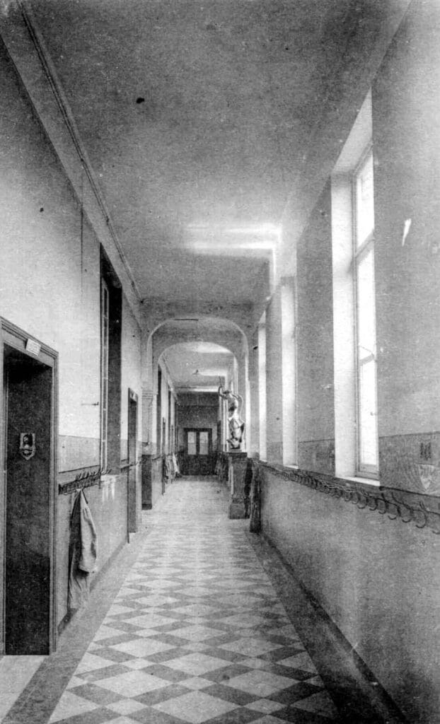 En 1896, l’Institution Saint-Michel compte 22 Frères et six laïcs pour assurer l’enseignement des 952 élèves fréquentant les 23 classes réparties en 4 écoles dans les divers quartiers de Verviers (Saint-Remacle, Saint-Joseph, Saint-Lambert et Saint-Michel). Des agrandissements sont alors envisagés et en 1897, un bâtiment est inauguré le long de l’actuelle rue du Gymnase : le bloc G, au fond de la cour, avec des classes au rez-de-chaussée, les chambres des Frères au premier étage et au second, une salle des fêtes.