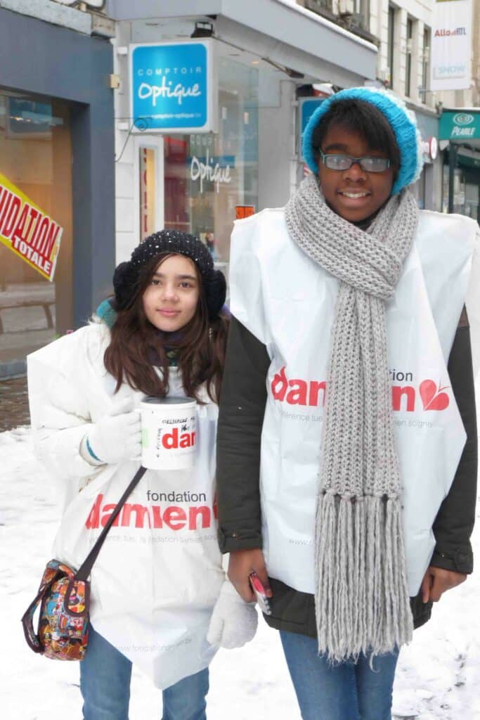 Ce samedi 24 janvier, sous  la houlette de M. Léon Fabry, une quinzaine d’élèves ont bravé la neige pour soutenir l’Action Damien. C’était une nouvelle initiative, car d’habitude on demande aux élèves de vendre individuellement sans action collective. Trois équipes se sont relayées entre 11h et 15h30. Chez les élèves, la bonne humeur était au rendez-vous, mais malheureusement, à cause des conditions climatiques, il n’y avait guère de monde dans le centre de la ville. Il faut dire aussi que pour les personnes moins à l’aise financièrement 6€ constituent déjà une grosse somme.