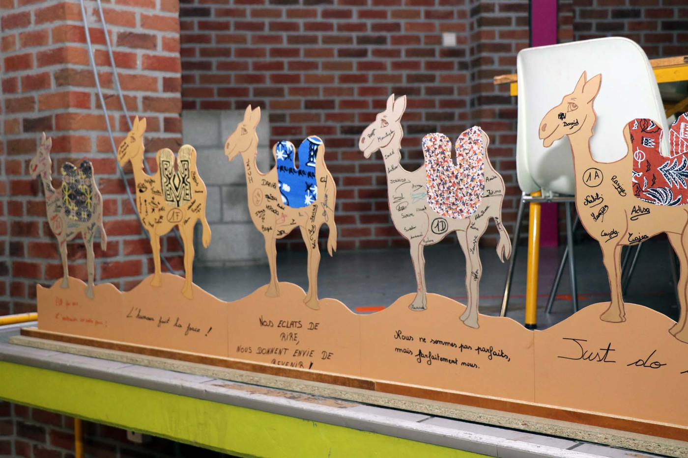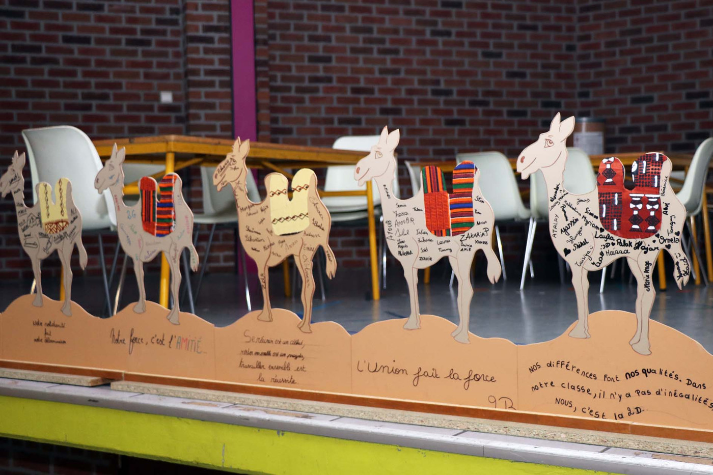 En feuilletant l’album ci-dessous, vous verrez sur deux photos une série de petits chameaux qui représentent les treize classes du premier degré. Solidaires, ils marchent ensemble dans l’amitié en se confrontant aux réalités de la vie de tous les jours. C’est le fruit d’un travail collaboratif, notamment avec les professeurs de religion. Belle idée! Bravo!