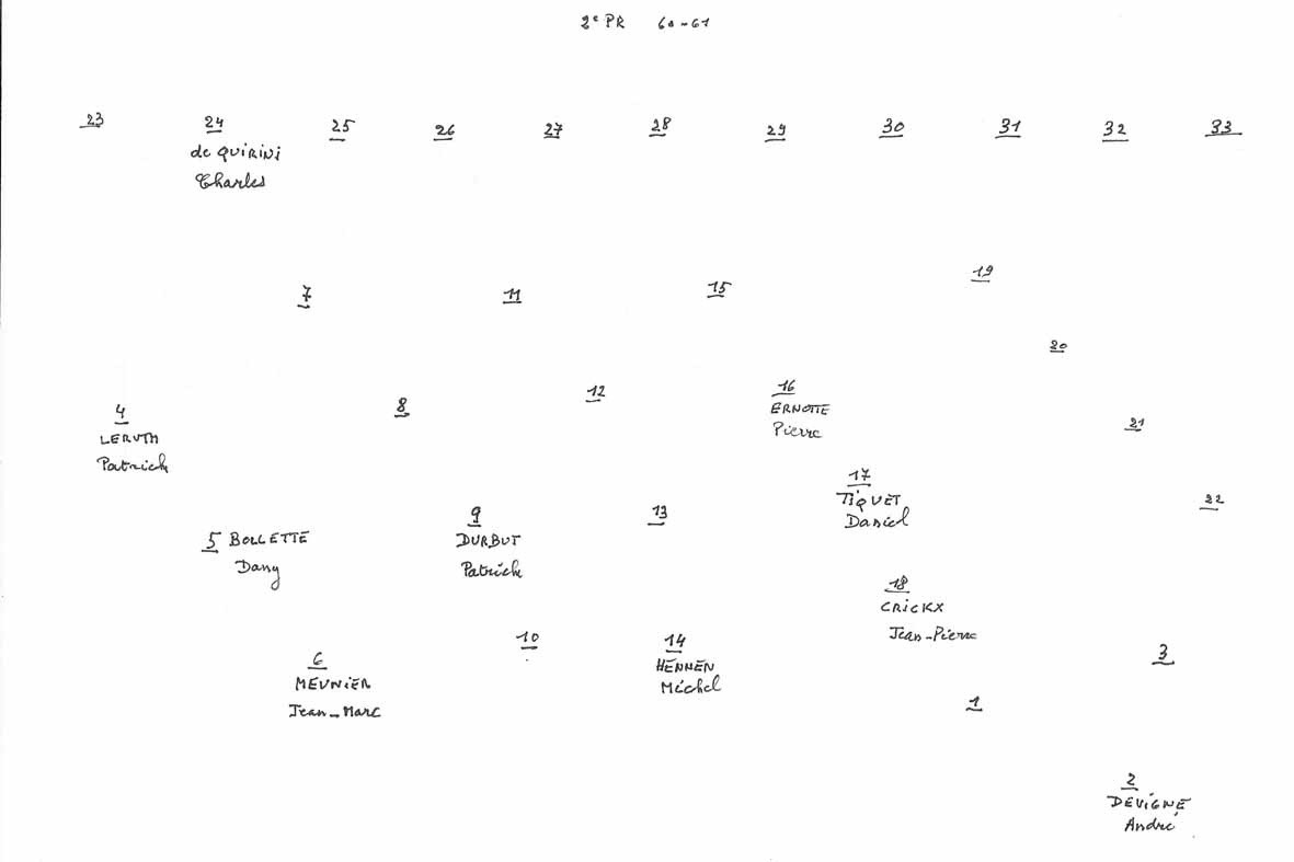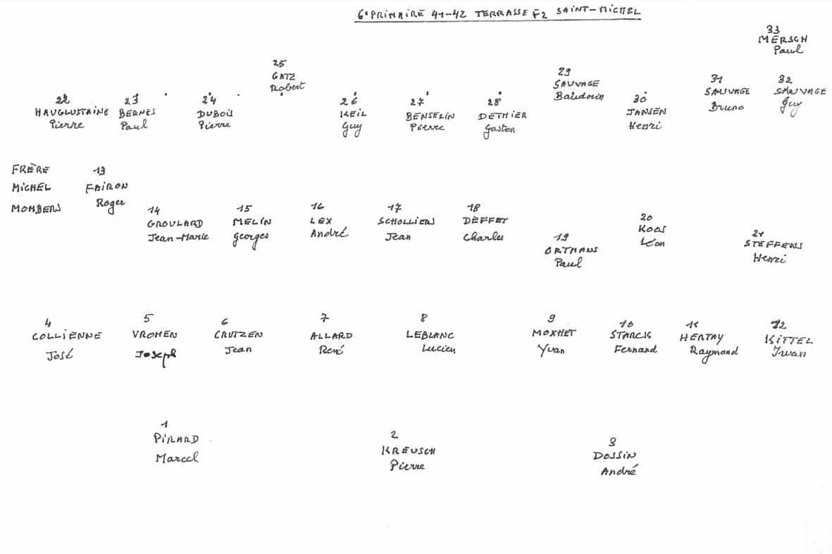 Grâce au patient travail du Frère Marc (décédé en 2014), certaines photos sont suivies d’un plan (plus ou moins complet) reprenant les noms des différents élèves.