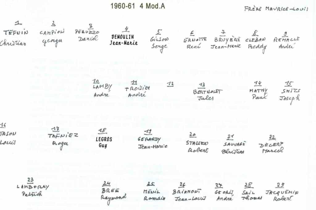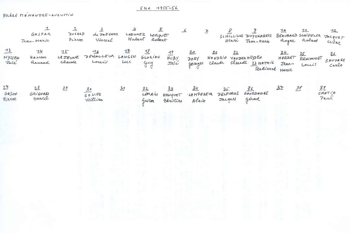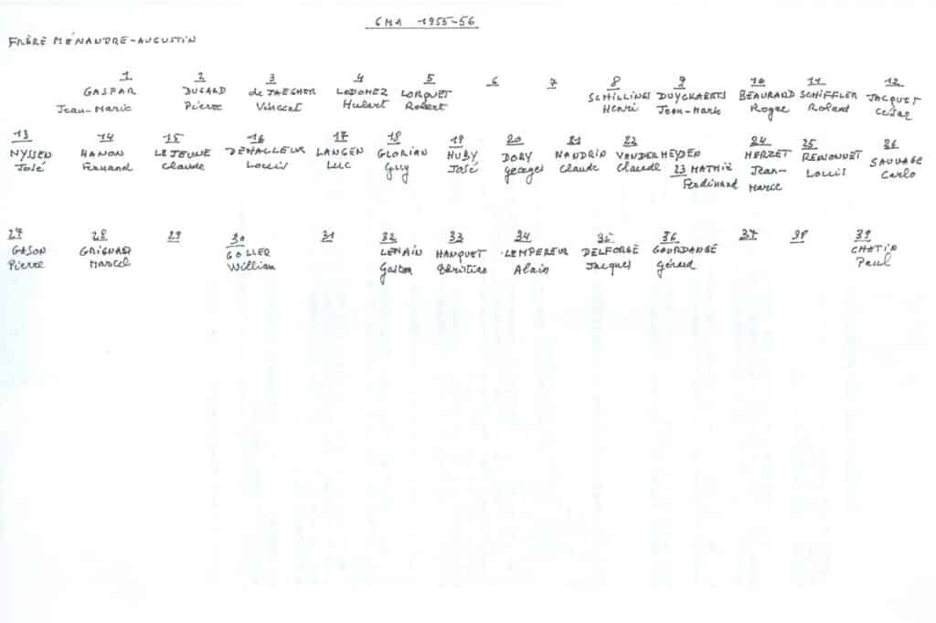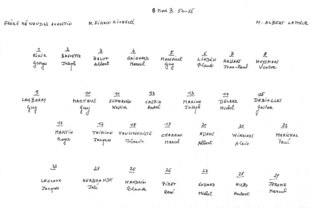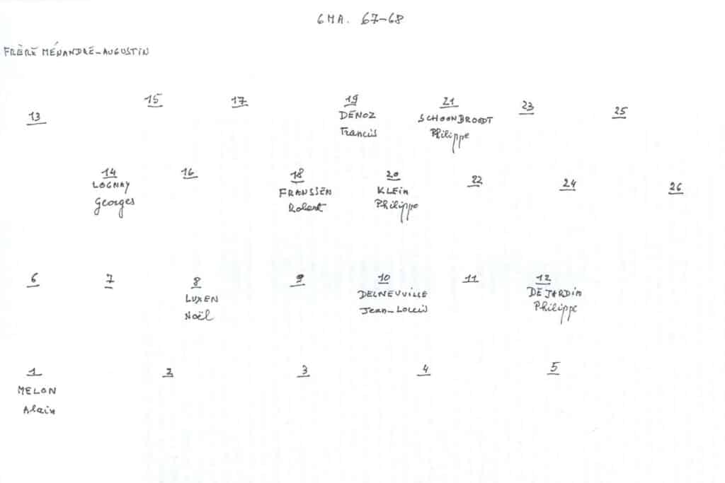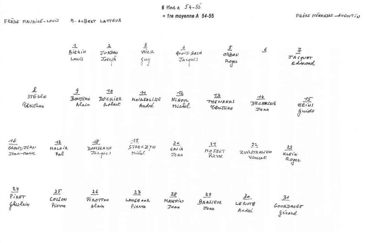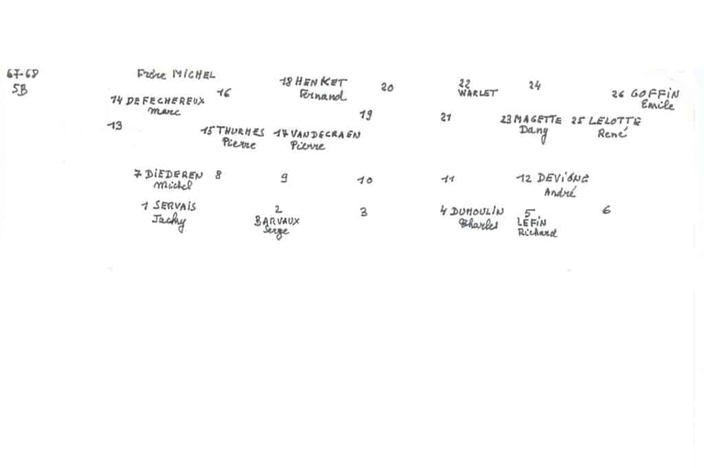 Grâce au patient travail du Frère Marc (décédé en 2014), de nombreuses photos sont suivies d’un plan (plus ou moins complet) reprenant les noms des différents élèves. Ce plan suit directement la photo.