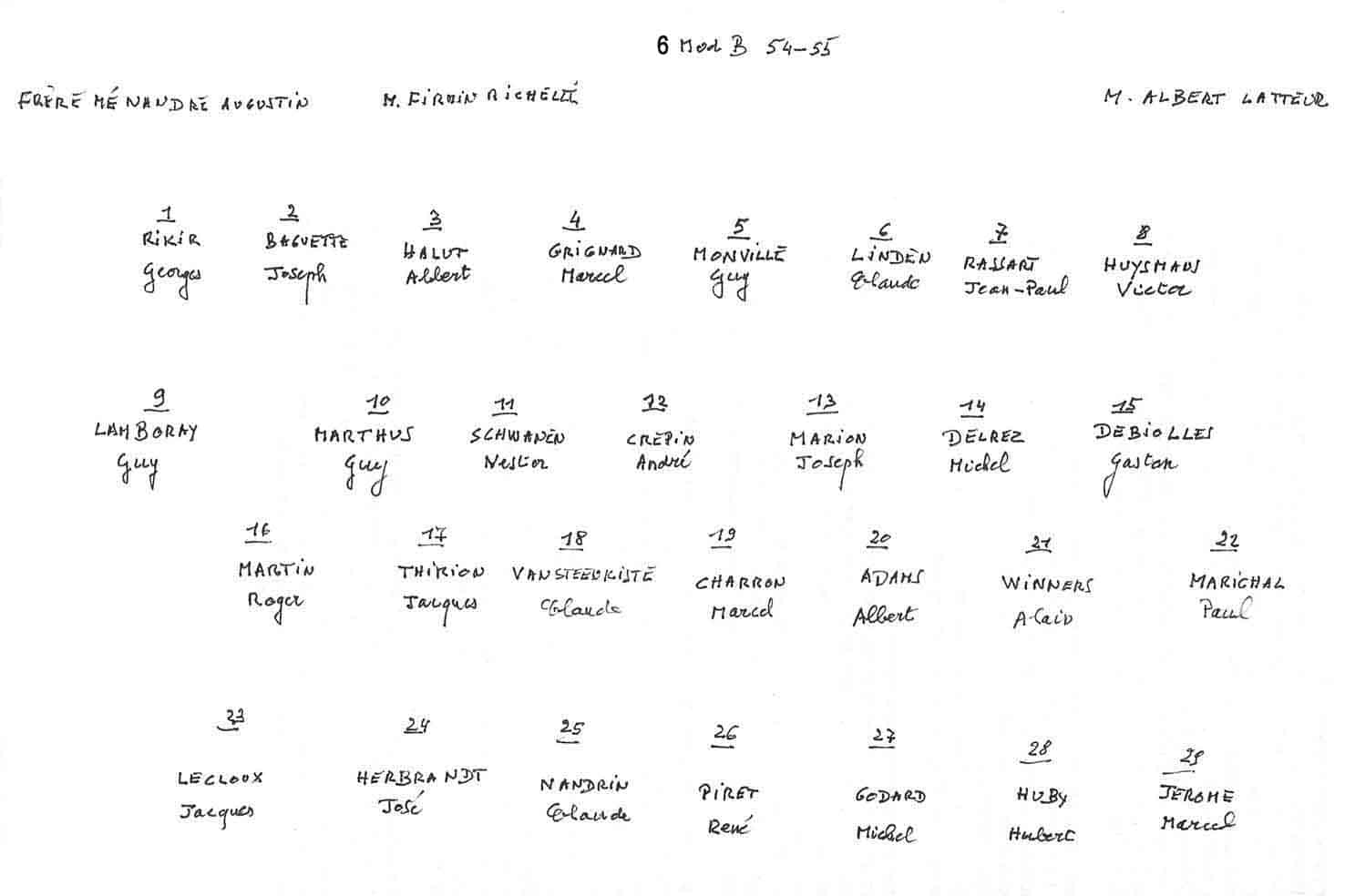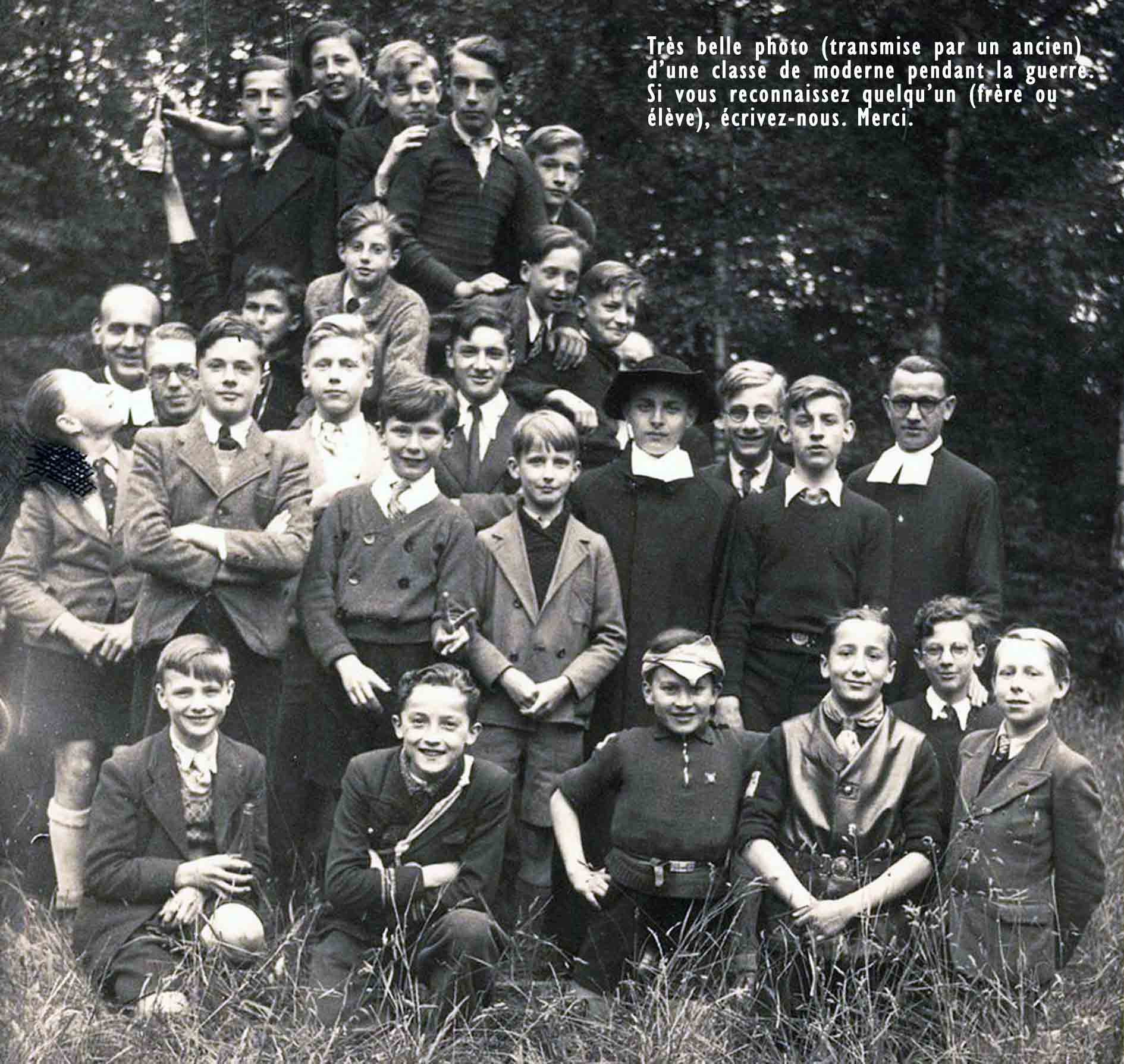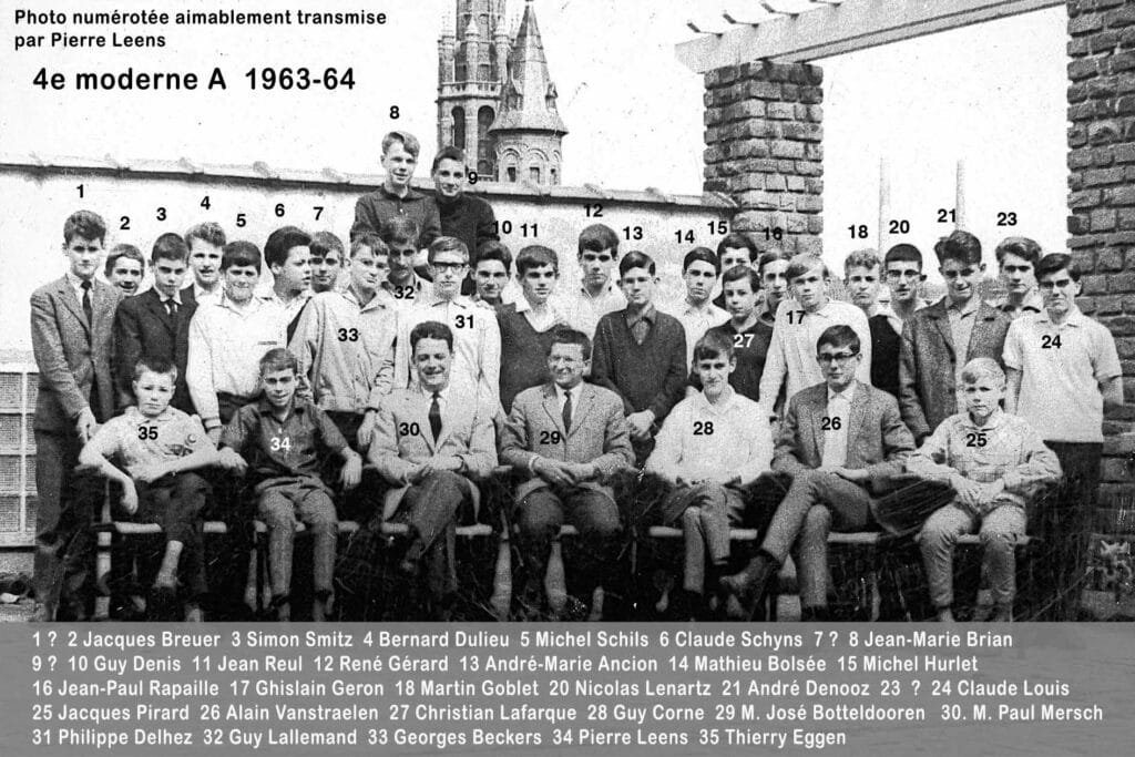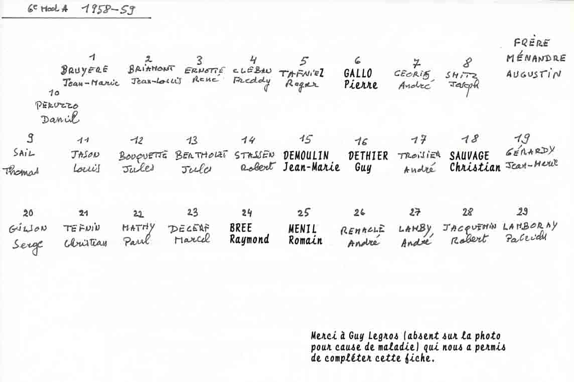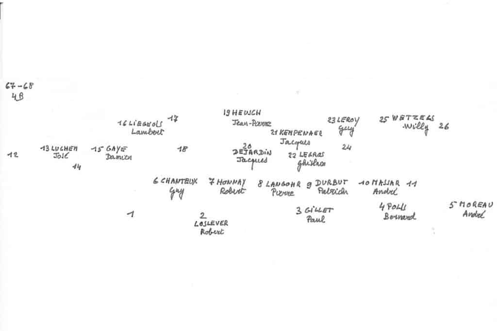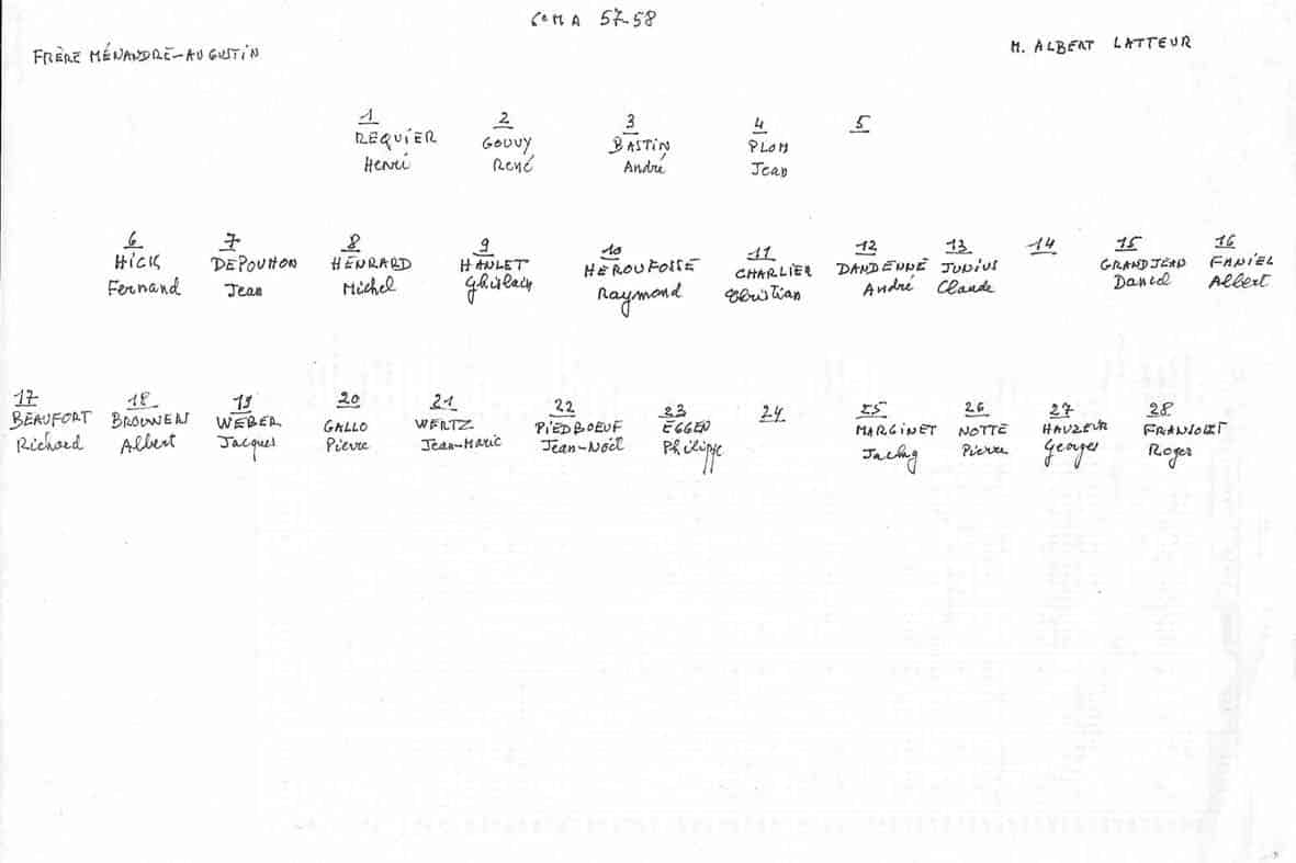 Grâce au patient travail du Frère Marc (décédé en 2014), de nombreuses photos sont suivies d’un plan (plus ou moins complet) reprenant les noms des différents élèves. Ce plan suit directement la photo.