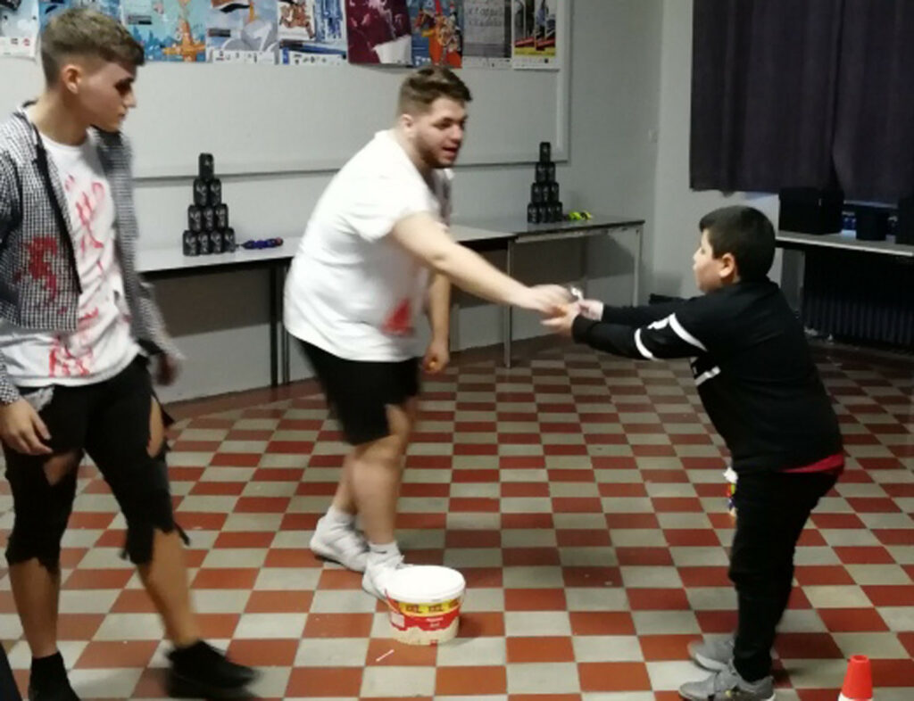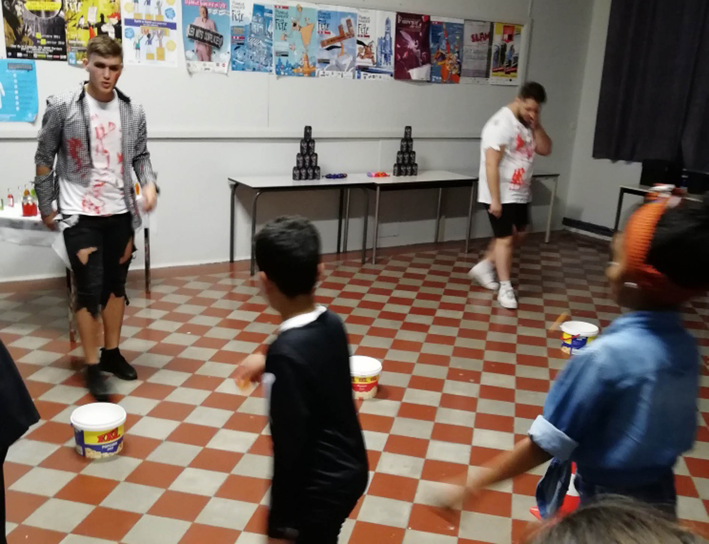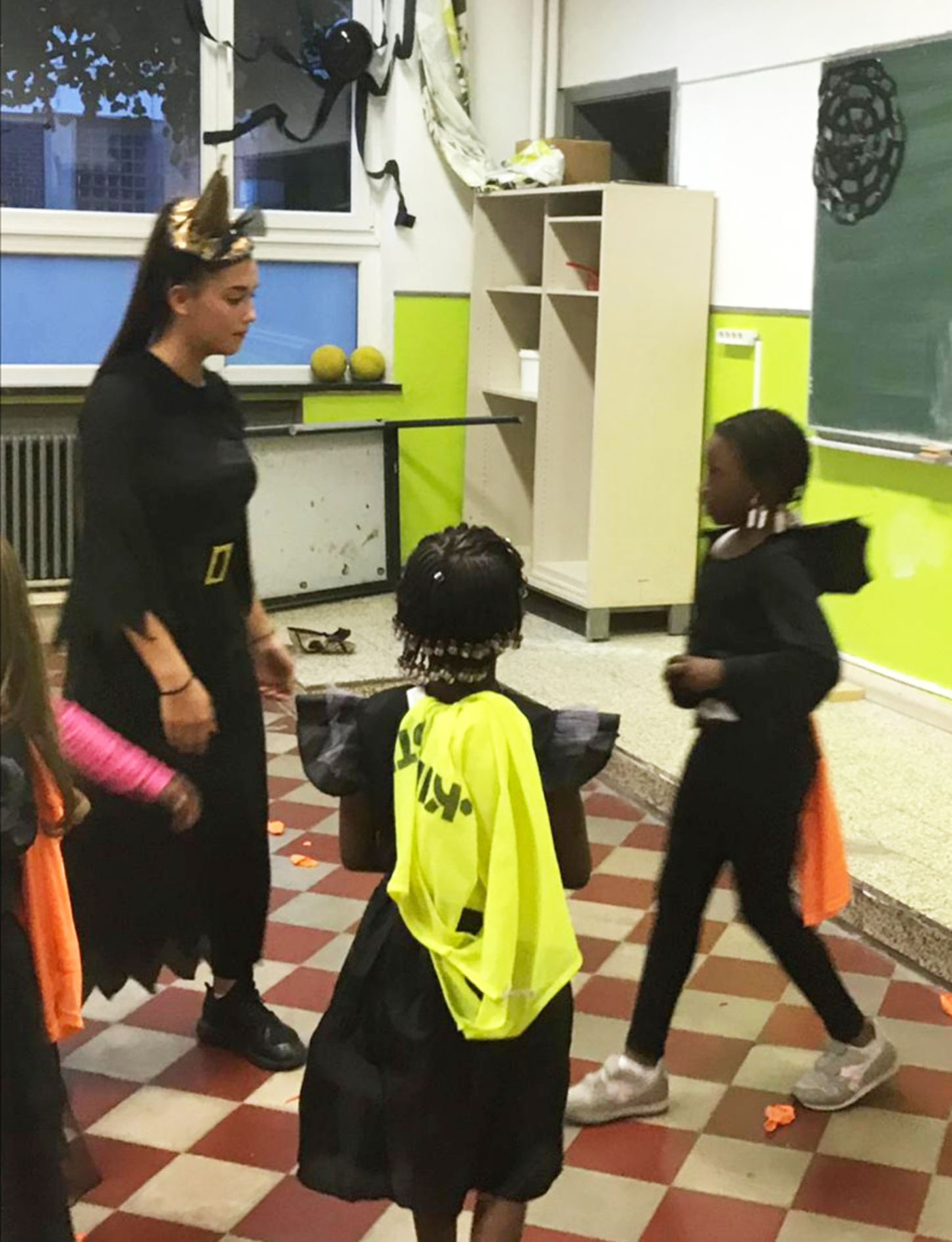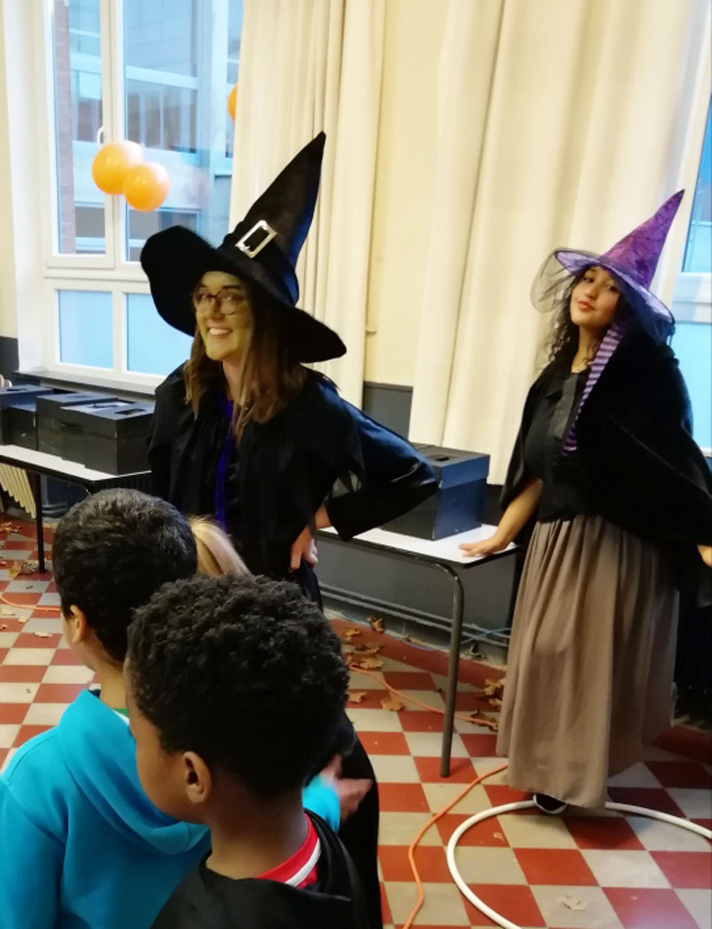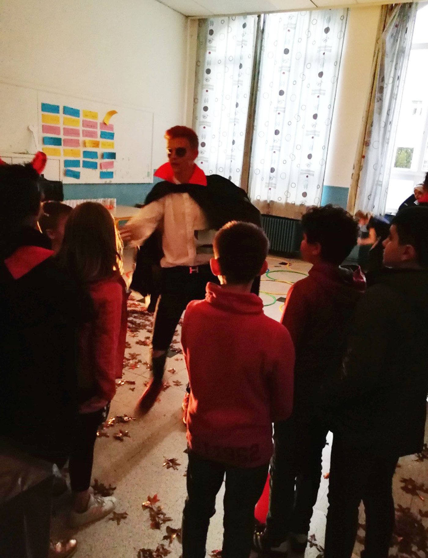 Il s’agit pour nos élèves d’une toute première animation, et d’un premier contact avec les enfants. Ils ont passé plus d’un mois à préparer méticuleusement cette activité dans le cadre de leurs cours d’option. Ils ont réalisé tous les décors, ont créé une histoire sur le thème, ont imaginé des jeux et les ont présentés activement aux enfants. Ils ont ensuite terminé la soirée par l’animation du bal d’Halloween où ils ont dansé avec les enfants.