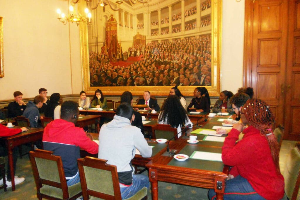 La matinée fut consacrée au musée de la B.N.B. récemment rénové. Une responsable nous a fait découvrir de manière interactive les différents rôles de cette institution. La B.N.B. est d’abord la banque des banques commerciales et elle assure aussi le contrôle de celles-ci. Ensuite, elle participe à la politique économique de la B.C.E. (Banque centrale européenne) : éviter les effets néfastes d’une inflation exagérée ou de son contraire, la déflation. Grâce à un simulateur, les élèves ont pu modifier les taux d’intérêt, à la hausse ou à la baisse, afin de maintenir une inflation raisonnable de 2%, ce qu’ils ont brillamment réussi. Enfin, le rôle traditionnel de la B.N.B. est d’émettre les billets, mais l’imprimerie sera bientôt délocalisée au Portugal pour des raisons de coûts. Notre guide a néanmoins montré aux élèves, exemples à l’appui, les différents moyens de détecter les faux billets. Toutefois, en fin de visite, il nous fut permis d’imprimer une panoplie de coupures à notre effigie et la professeur d’économie ne fut pas la dernière à profiter de l’opportunité. (Voir la dernière photo de l’album ci-dessous)