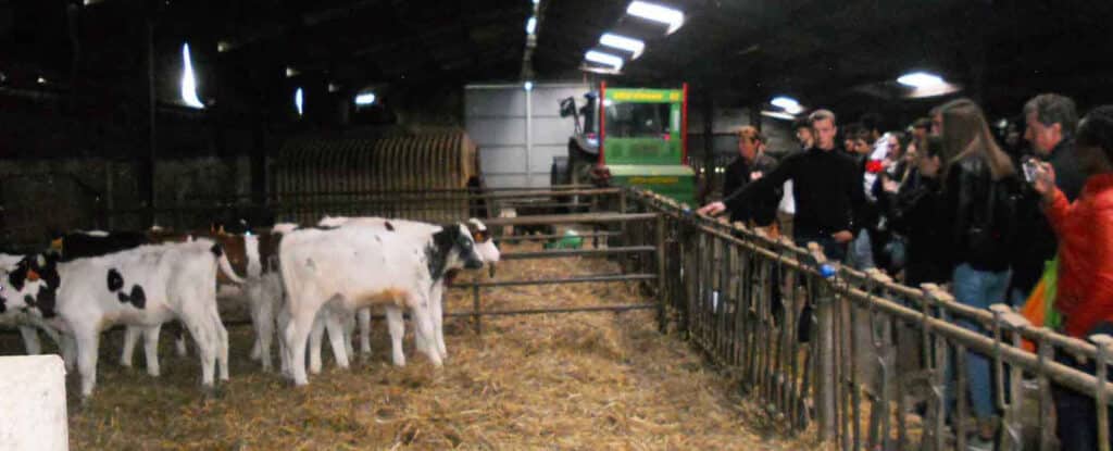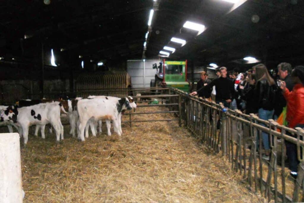 La visite des installations s’est achevée par les étables. Pour les vaches, le principe de stabulation libre est appliqué : elles se déplacent librement dans l’étable, où la distribution de la nourriture est automatisée en fonction des besoins individuels de chaque bête. M. Lambert nous a expliqué que chacune dispose de son passeport, afin d’assurer la traçabilité de la production. Enfin, nous sommes arrivés dans l’étable dédiée aux veaux. Les exclamations fusent : « Qu’ils sont beaux ! », « Qu’ils ont l’air gentils ! », « Des photos ! ». Force est de constater que non, la ferme n’est pas tout à fait une entreprise comme les autres : ici, on travaille avec des êtres vivants.